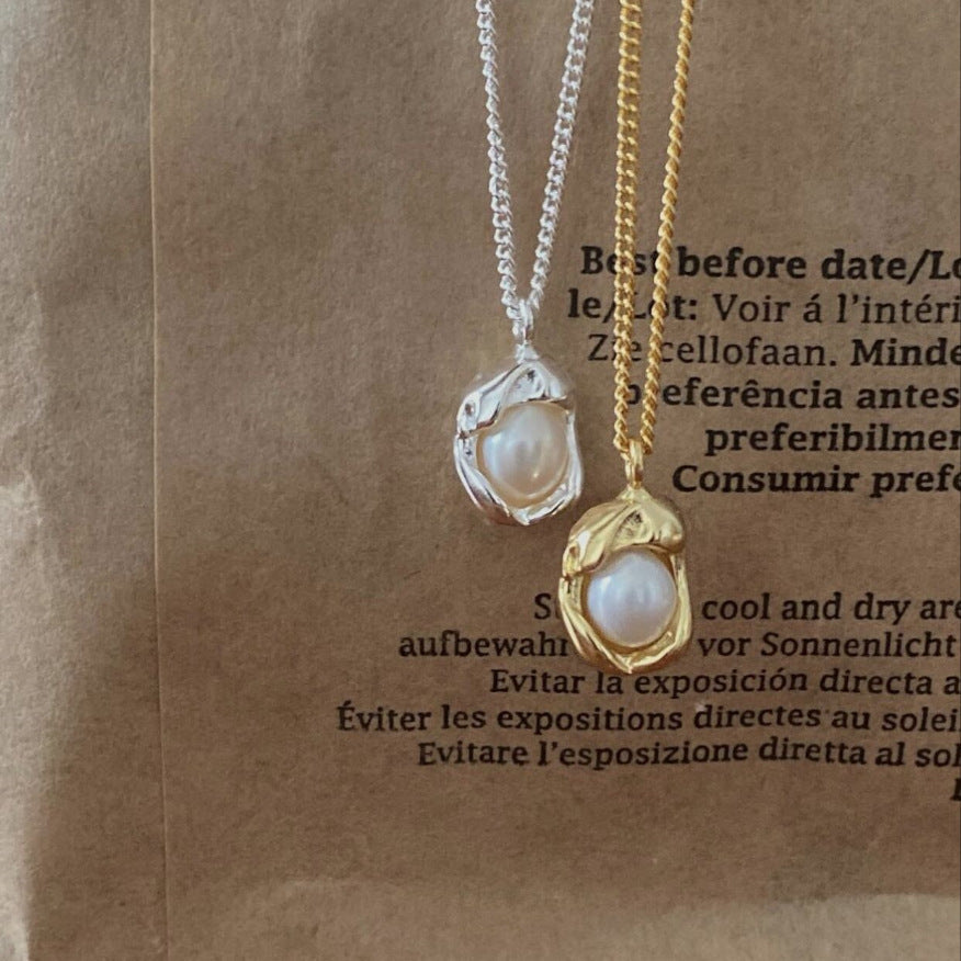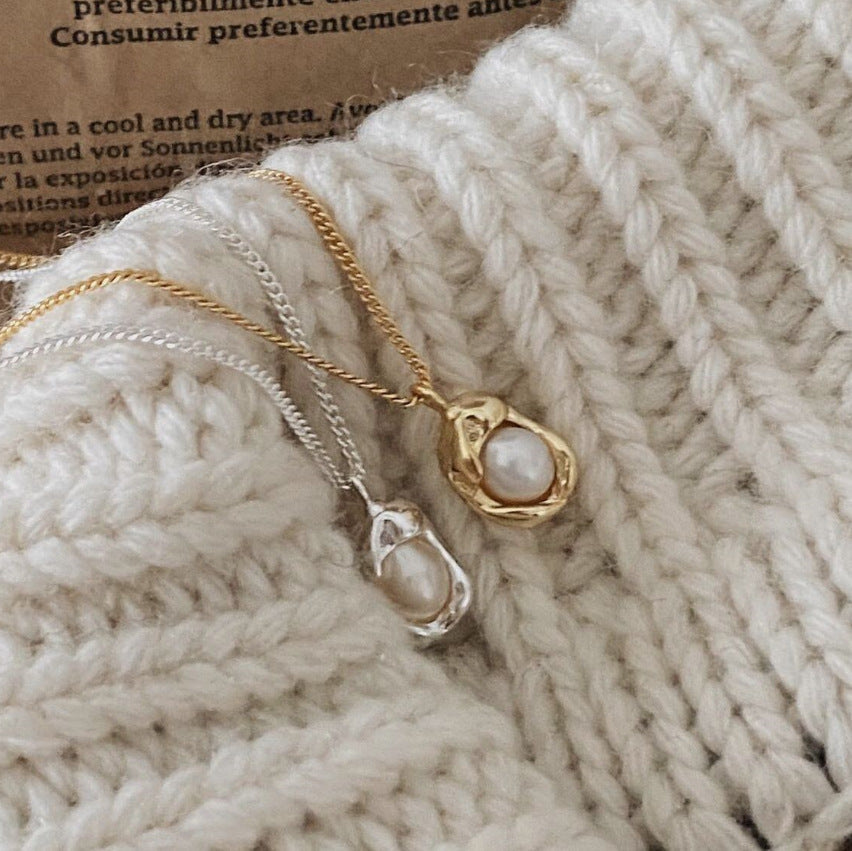 This irregular melting design necklace is designed in 925 sterling silver. Set with a small delicate pearl, it is elegant and simple for all occasions.